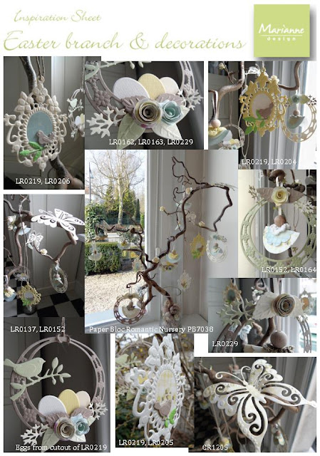 Korte uitleg: "Een paastak versierd met pastelkleurige decoraties gemaakt van het nieuwe Paper Bloc ‘Romantic Nursery’ en Creatables. Vooral de LR0219 van deze maand lee t zich erg goed voor elegante hangers. De vogeltjes van de Tuin-creatables (LR0204, LR0205 en LR0206) van afgelopen januari passen hier leuk bij.